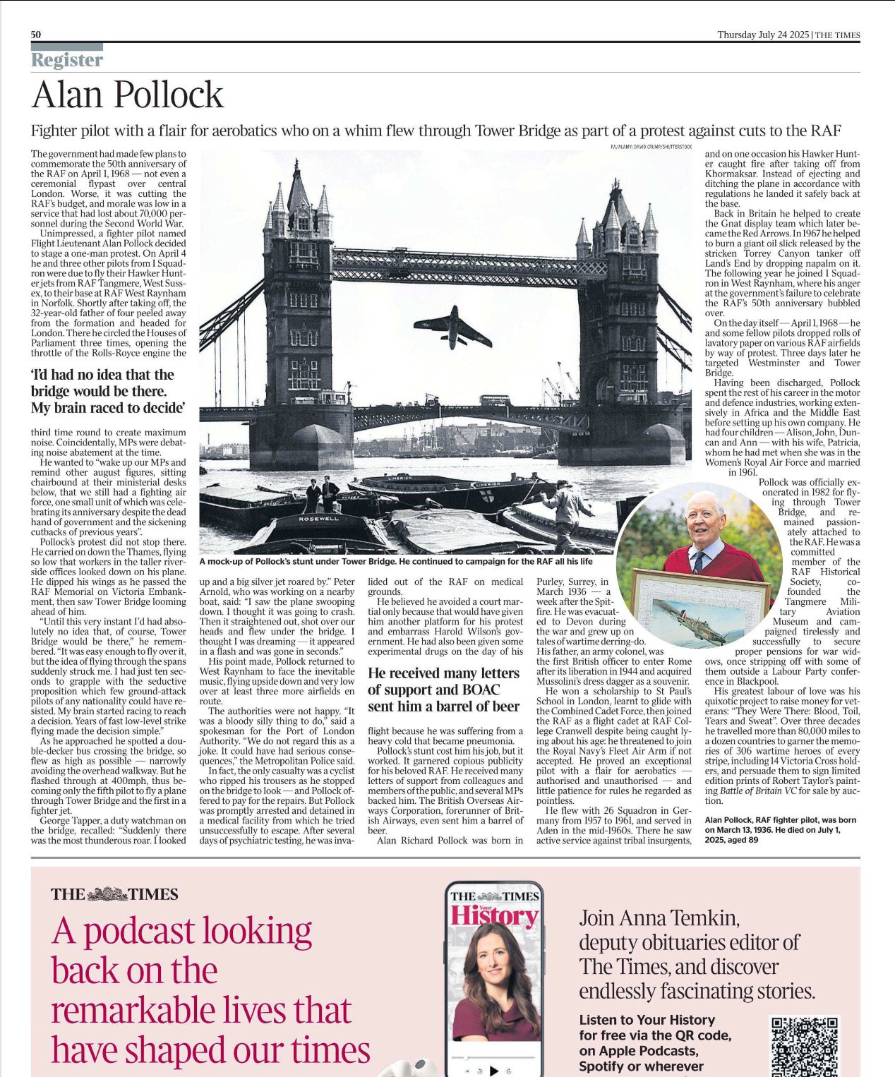 Alan contributed many articles to Fourfax over the years. He was famous, of course, for his flight under the upper span of Tower Bridge in 1968.