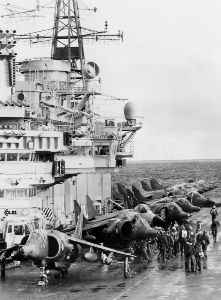 - The crowded deck of HMS Hermes in good weather with RAF GR3s in the force ground armed with CBUs and a Reece Pod and Sea Harriers