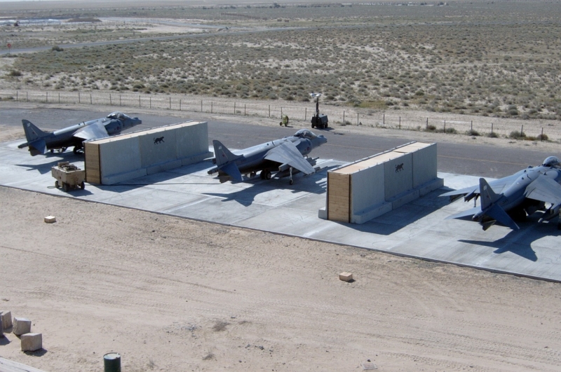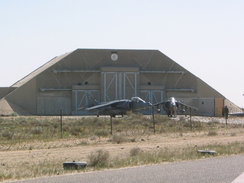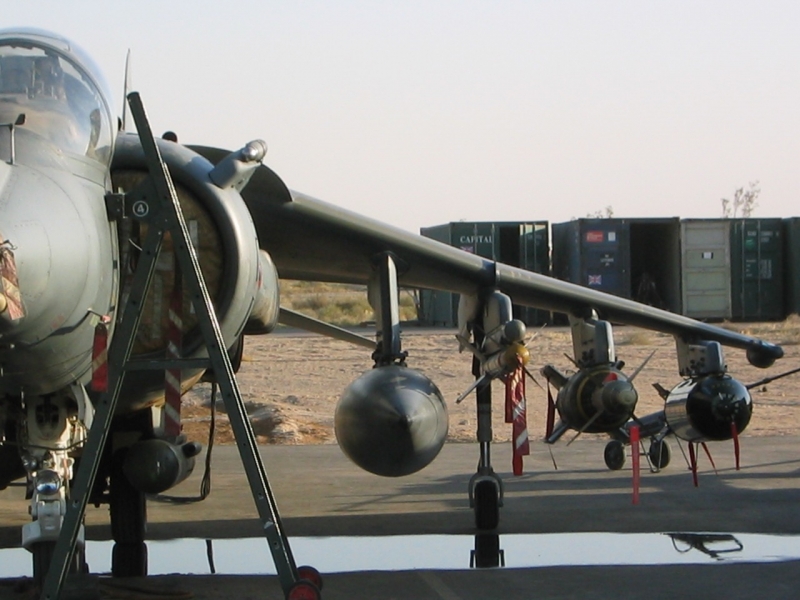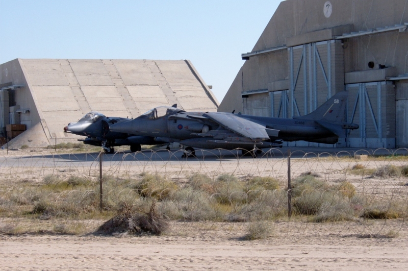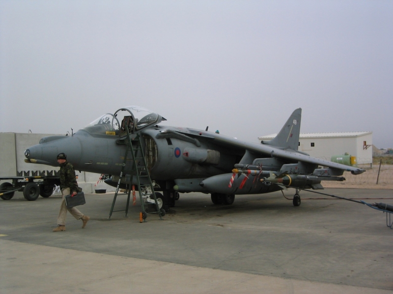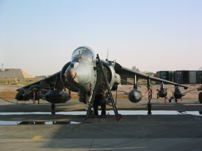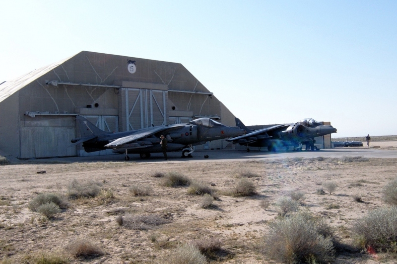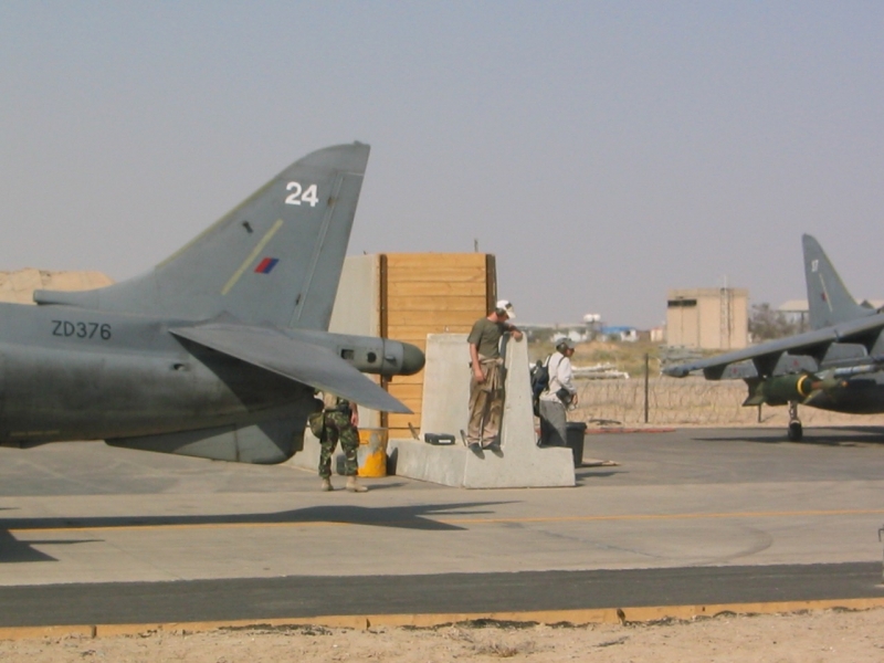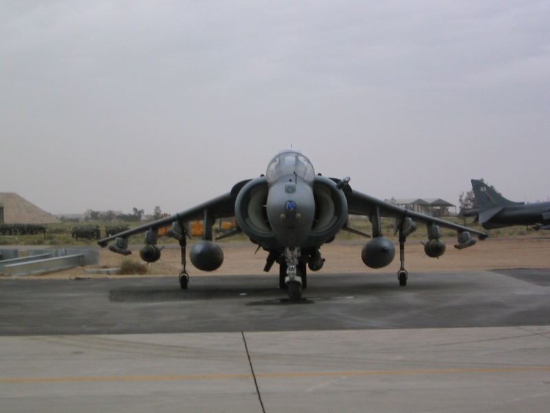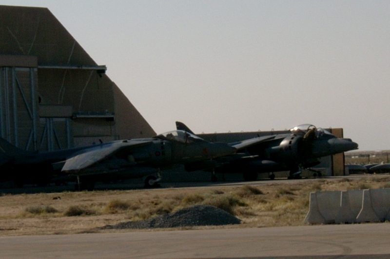 British Harrier G7s taxi in their base in Kuwait prior to their mission over southern Iraq March 18, 2003. Aircraft from the U.S. and Britain are continuing to enforce the no fly zone over southern Iraq. POOL REUTERS/Russell Boyce