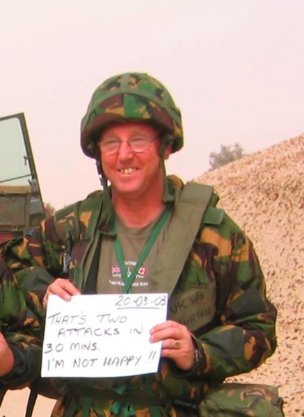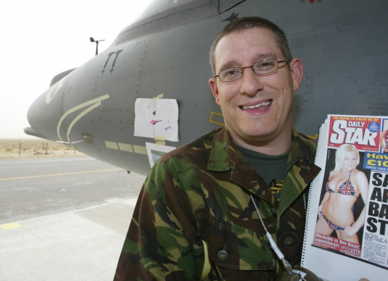 Cpl Adrian Bland stands with a British Royal Air Force Harrier GR7 with today's copy of the Star on their base in Kuwait March 26, 2003. REUTERS/Russell Boyce