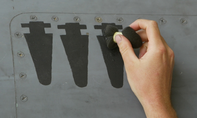 A British Royal Air Force artist paints maverick missile symbols on a Harrier GR7 on its base in Kuwait March 24, 2003. Each symbol represents the battle honour of a maverick missile being fired during a mission over Iraq. POOL REUTERS/Russell Boyce
