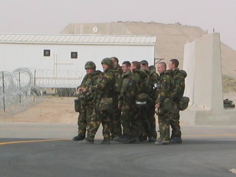 Men and women from the British Royal Air Force Joint Harrier detachment stand with a banner infront of a Harrier GR7 sending a happy Mother's Day message from their airbase in Kuwait March 29, 2003. POOL REUTERS/Russell Boyce