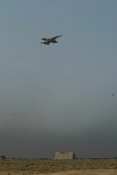 A British Royal Air Force Harrier GR7 comes into land on their base in Kuwait March 24, 2003. POOL REUTERS/Russell Boyce