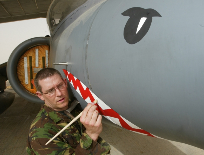 Cpl Adrian Bland paints sharks teeth and eyes onto a British Royal Air Force Harrier GR7 as poor weather prevents flying from their base in Kuwait March 26, 2003. This is the first time a British Harrier GR7 has been painted this way, with aircraft only being decorated like this during times of actual conflict. POOL REUTERS/Russell Boyce