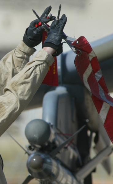 A RAF ground crew known as a "liney" holds the safety pins high to show the pilot of a British Harrier GR7 that the aircraft is armed prior to its mission over southern Iraq March 18, 2003. Aircraft from the U.S. and Britain are continuing to enforce the no fly zone over southern Iraq. POOL REUTERS/Russell Boyce