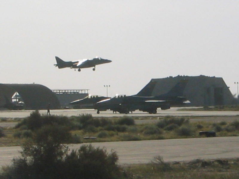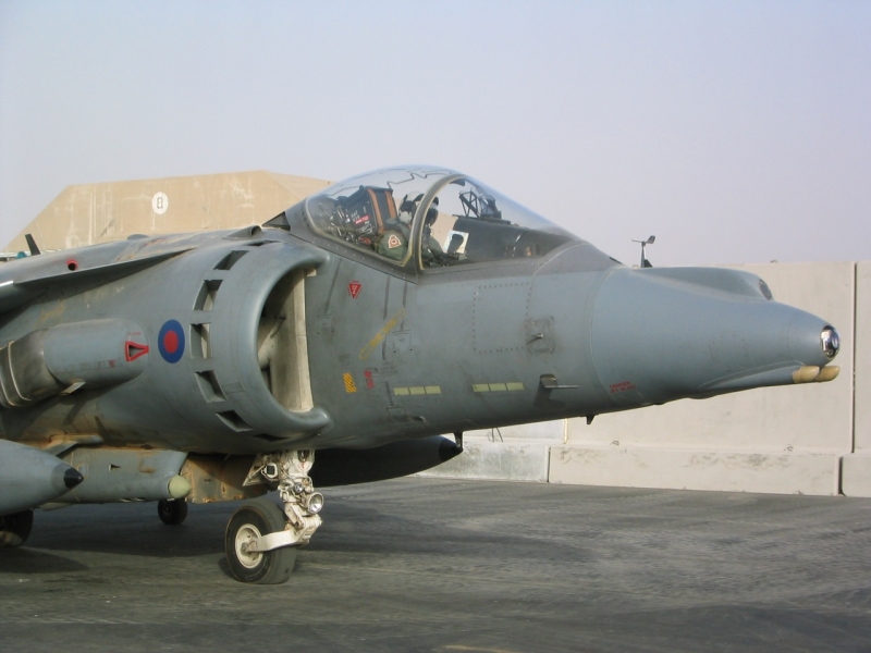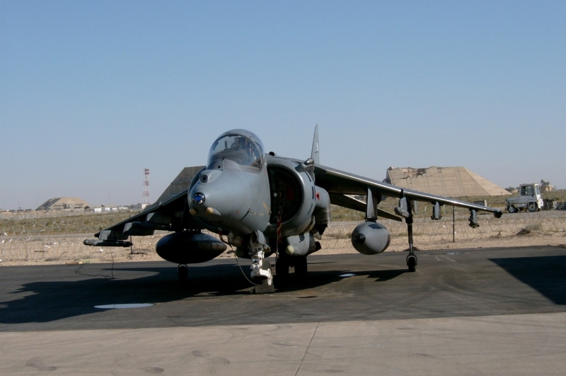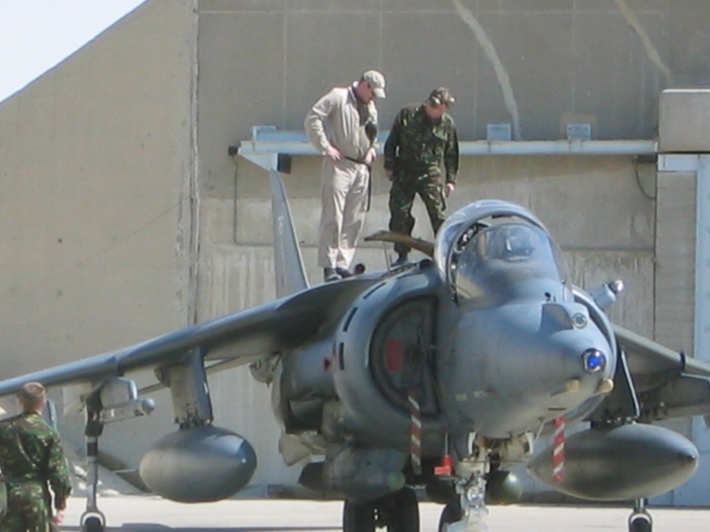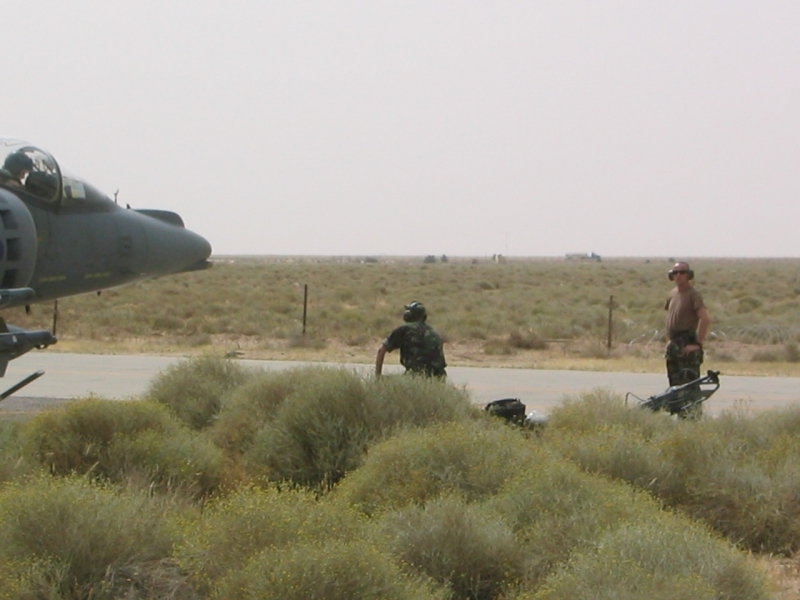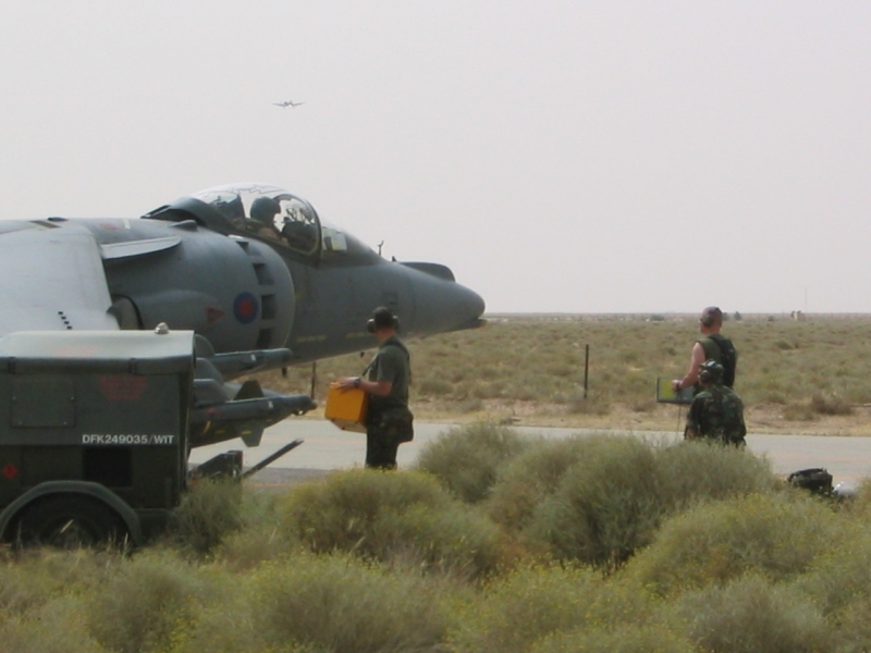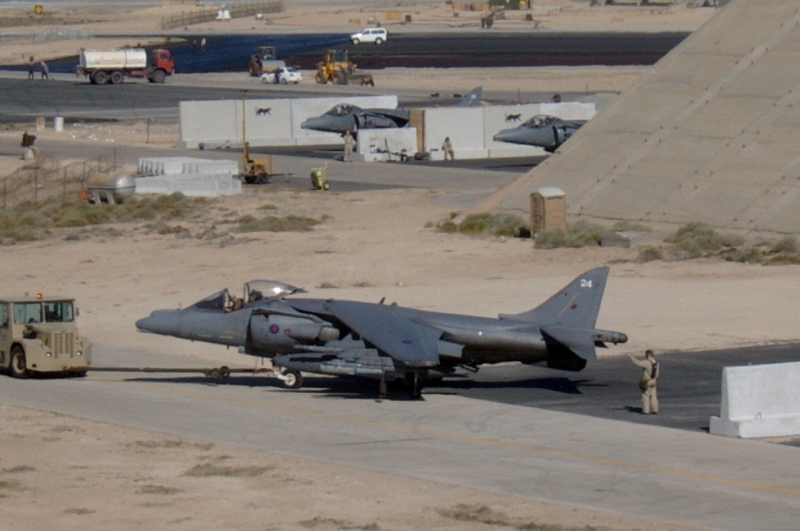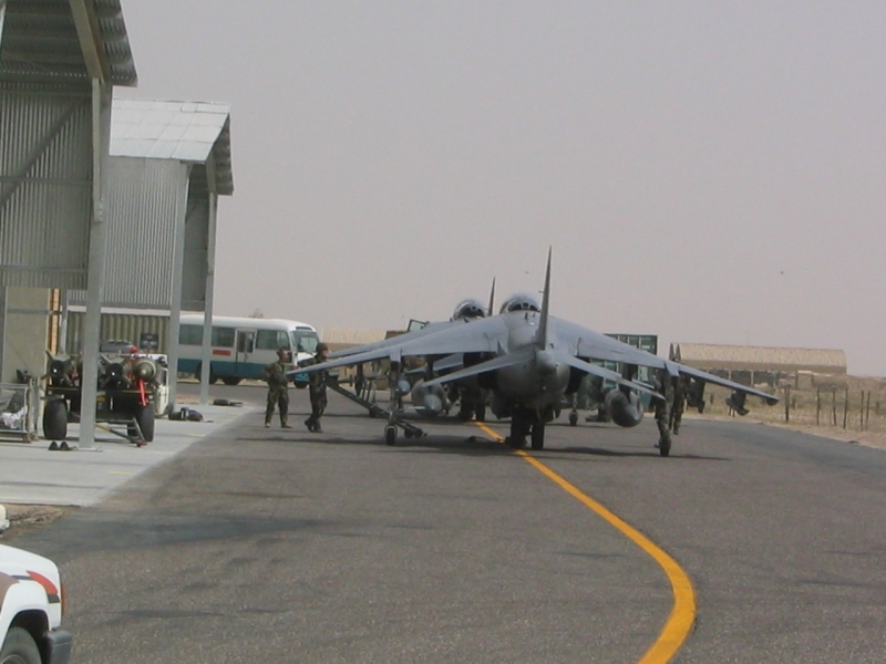 A British Royal Air Force ground crew member marshalls out a Harrier GR7 on their base in Kuwait prior to its mission over Iraq March 29, 2003. POOL REUTERS/Russell Boyce