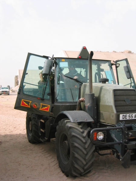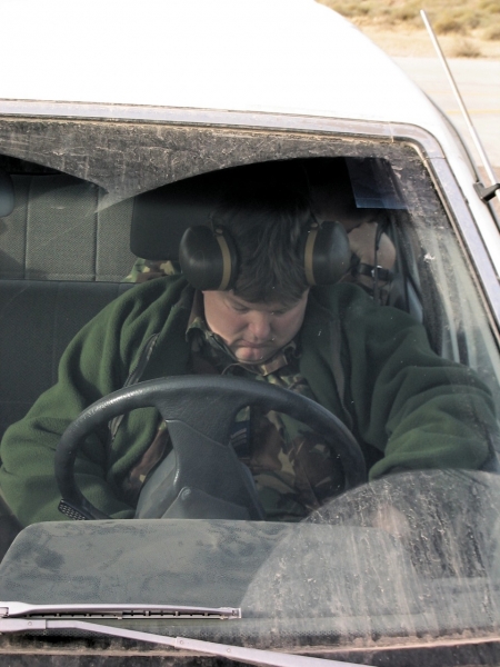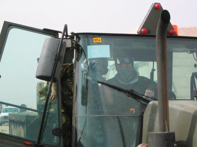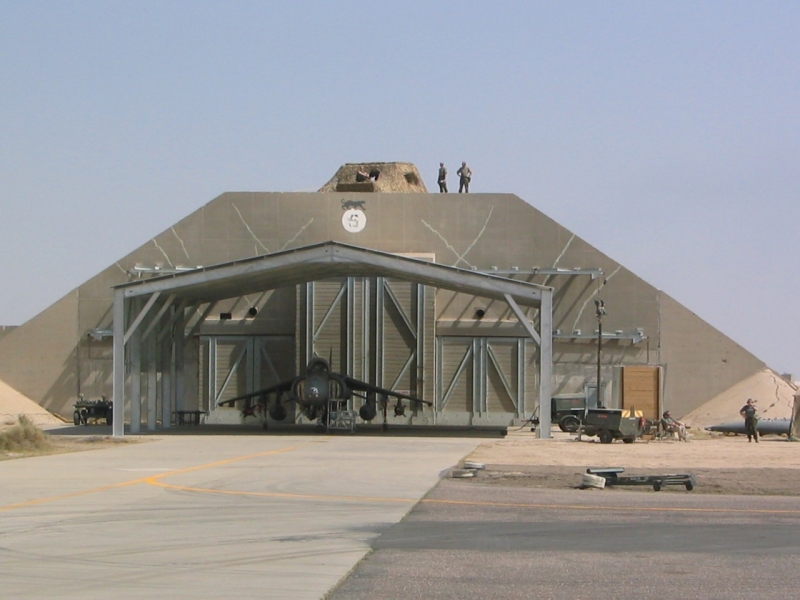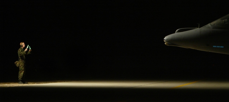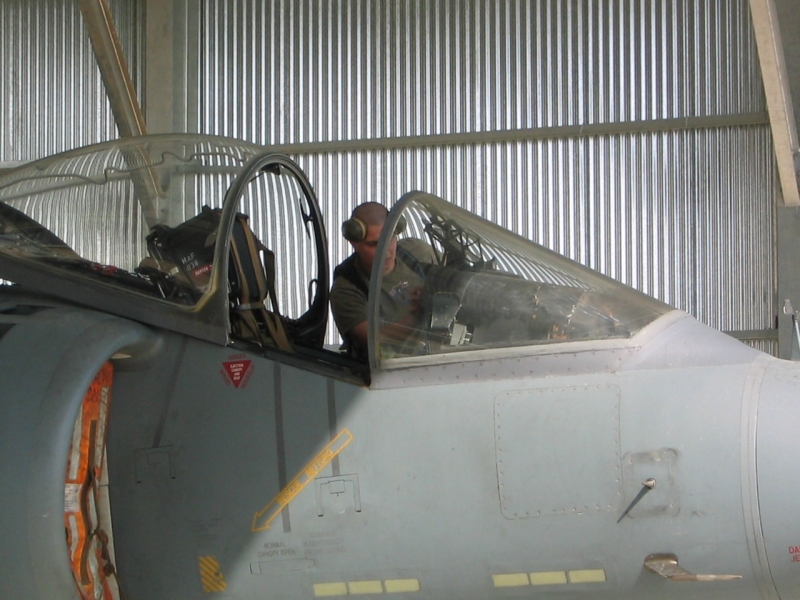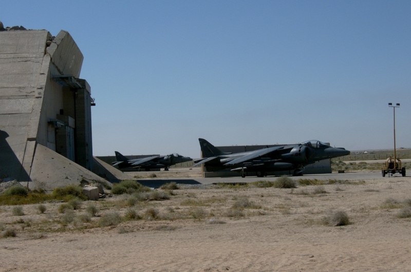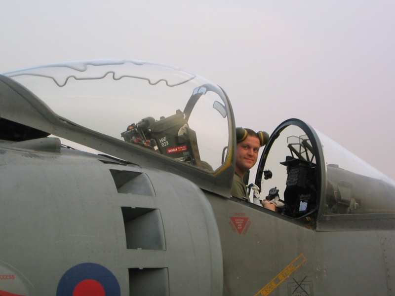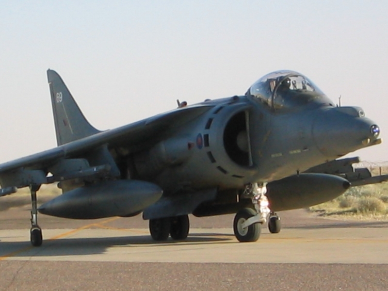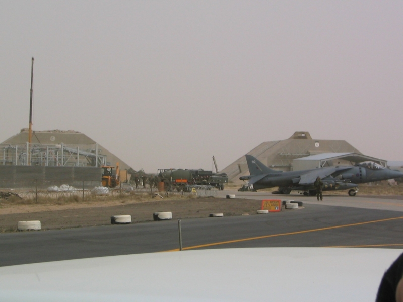 A British Royal Air Force ground crew member marshalls out a Harrier GR7 on their base in Kuwait prior to its mission over Iraq March 29, 2003. POOL REUTERS/Russell Boyce