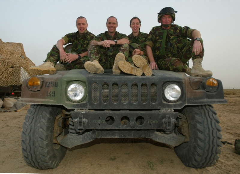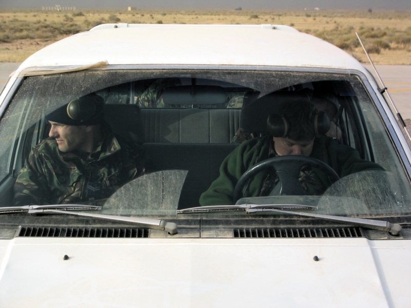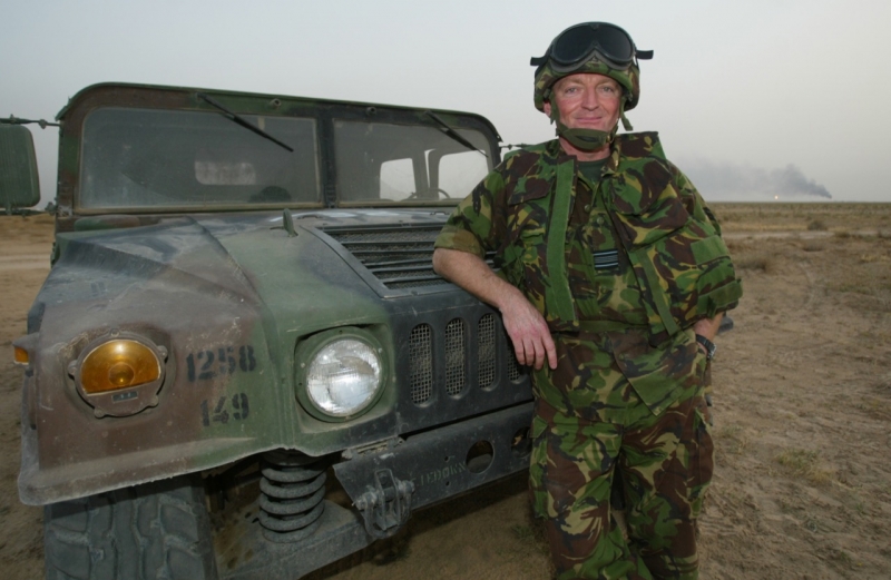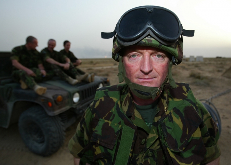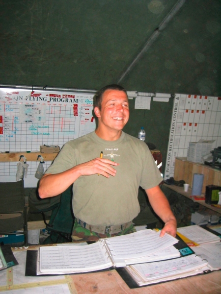British Harrier pilot Squadron Leader Andy Lewis looks at the time as he walks to his armed Harrier GR7 in Kuwait March 17, 2003. Aircraft from the U.S. and Britain are continuing to enforce the no fly zone over southern Iraq. POOL REUTERS/Russell Boyce